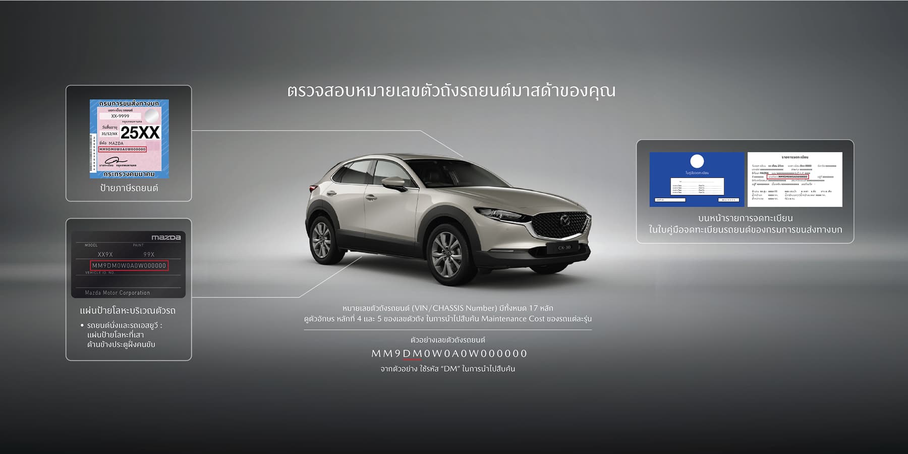 รถยนต์มาสด้าทุกคันจะมีหมายเลขตัวถัง 17 หลัก ลูกค้าสามารถตรวจสอบหมายเลขตัวถังรถยนต์ได้จาก 3 สิ่งนี้